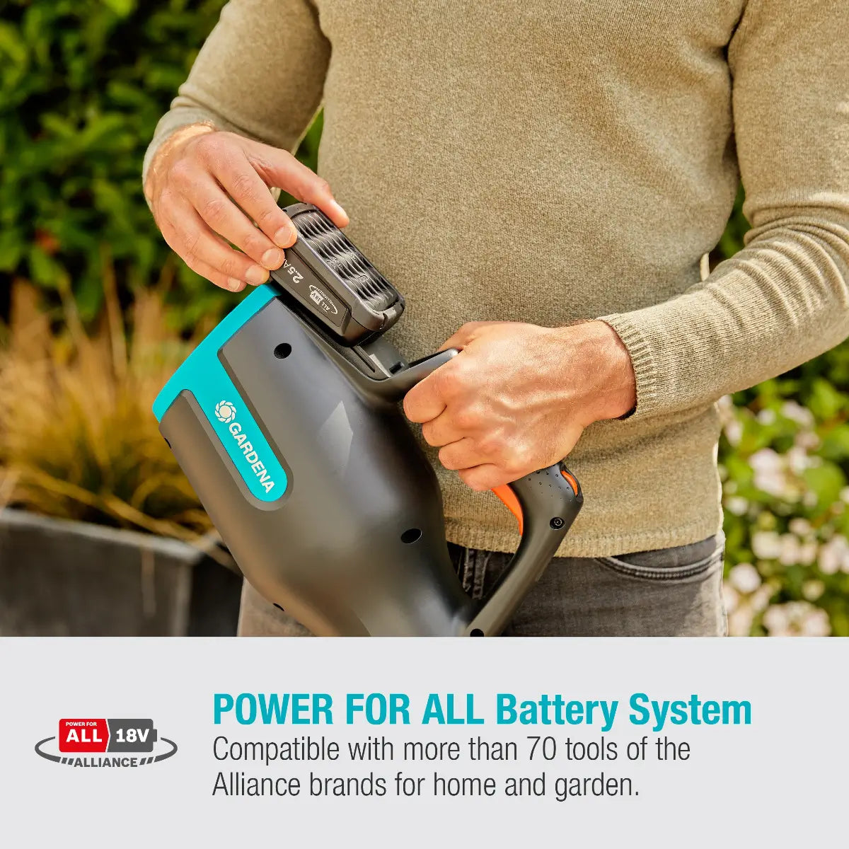 The Battery Blower PowerJet 18V P4A solo is supplied without battery and charger. It is compatible with all 18V batteries from the POWER FOR ALL ALLIANCE, one of the largest cross-brand battery alliances of leading manufacturers. These batteries can be used for numerous devices around the house and garden. So you save money and remain flexible! Would you prefer to buy the product with the battery system? Not a problem – then the Ready-To-Use Set is the right one for you. Passion powered by GARDENA – Battery garden equipment that gives you the freedom to create.
