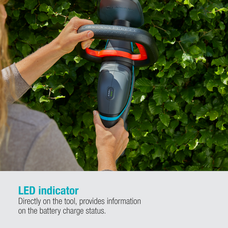 Thanks to a clearly visible LED indicator directly on the tool, you are always aware of the current charge level, so you’ll know when it is time to take a break to either charge it or connect another battery. The Hedge Trimmer is compatible with all batteries from the 18V POWER FOR ALL ALLIANCE. Depending on the type of battery used, the product can reach a battery run time of up to 135 minutes and cut up to 450 square metres of hedge.