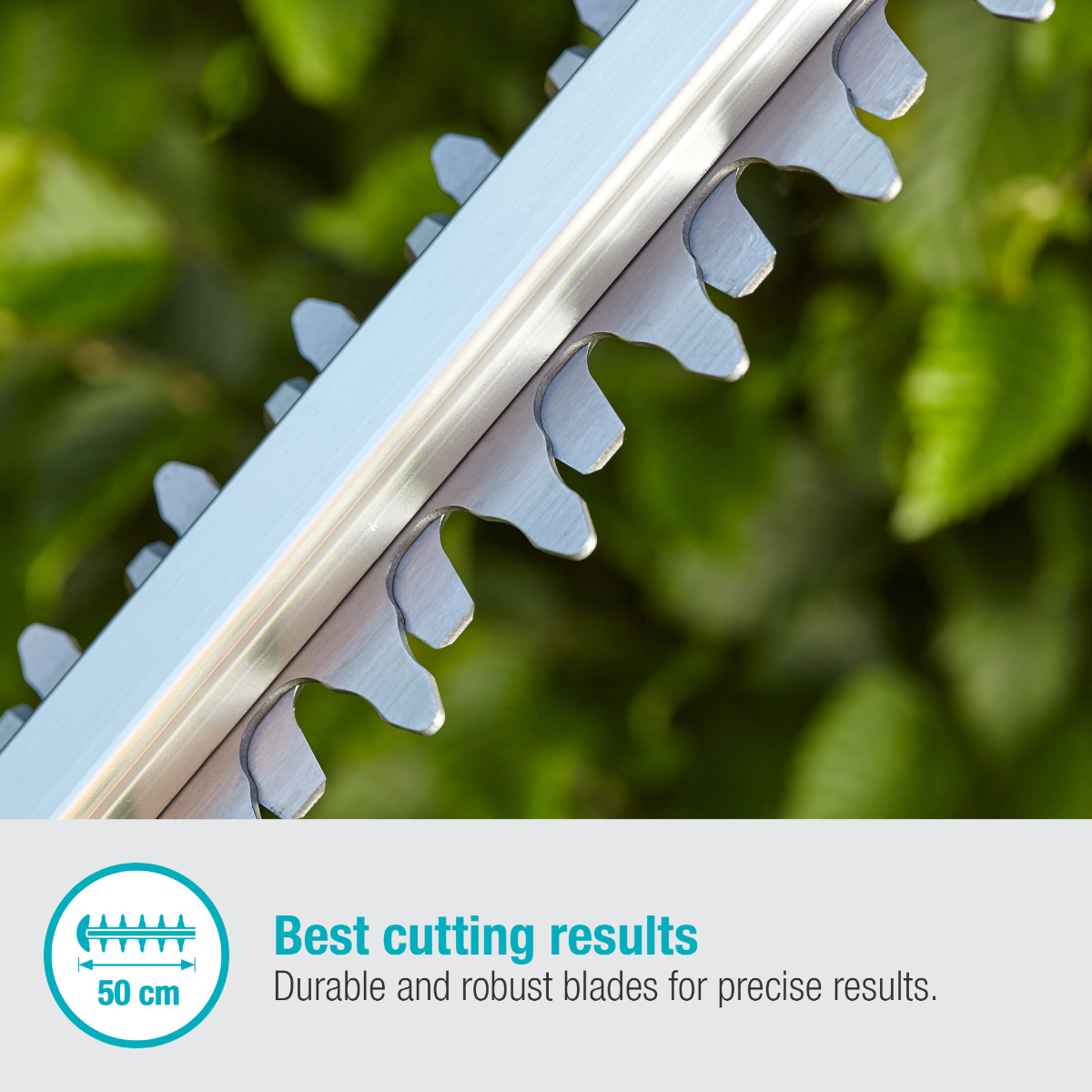 With its ErgoLine handle with integrated switch, the shears with a blade length of 50 centimetres always fit comfortably in your hand, no matter what position you are working in. When cutting close to the ground or along walls, the impact protection at the tip of the blade ensures that the blades are not damaged. The blade geometry is perfectly designed so that the cut is always clean and the work is easy to perform – without interruptions. We know you’ll be impressed with the results! With the ComfortCut, hedge trimming is no longer a tiresome, strenuous chore, but one that can be completed in no time at all.