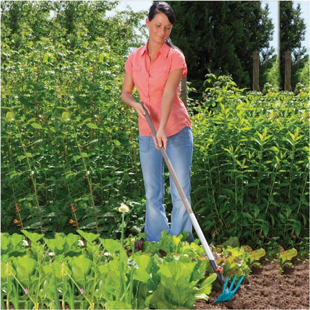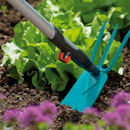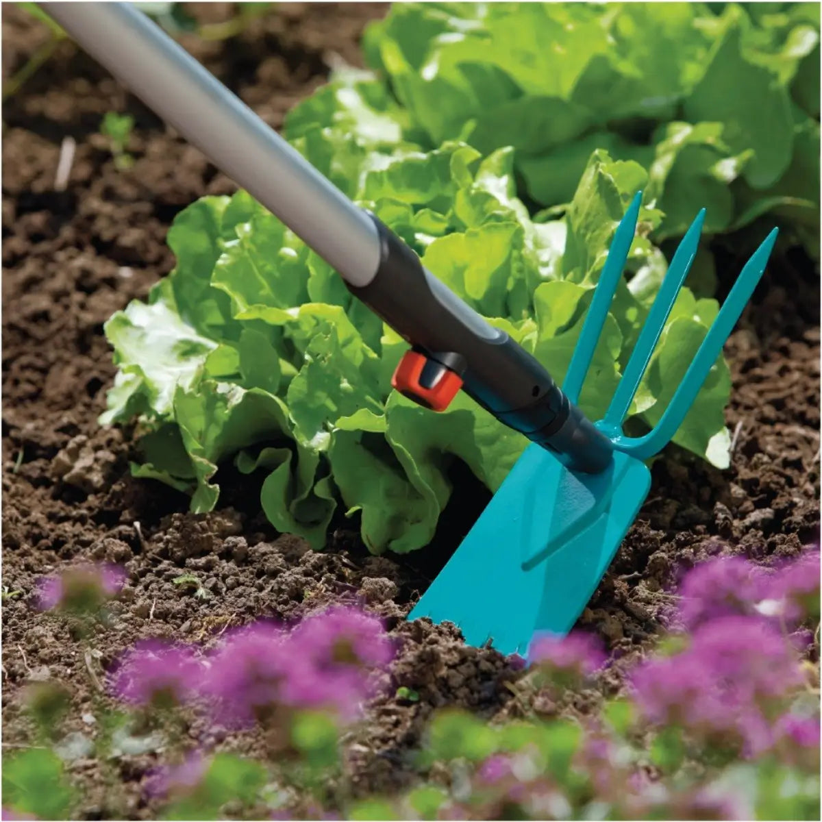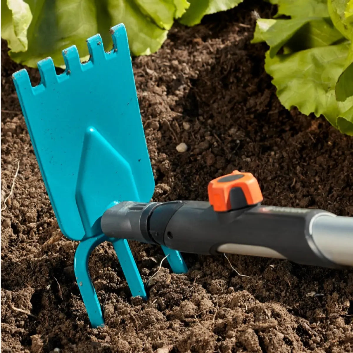 The practical combisystem Garden Hoe from GARDENA with its working width of 9 cm helps you with the plant-sparing garden care in close-set rows and beds. The GARDENA combisystem allows for flexible use, thanks to the exchangeable attachments. The Garden Hoe is compatible with all handles of the GARDENA combisystem and can be mounted and secured with the handle. GARDENA recommends a handle with a length of 130 or 150 cm, the selection of the handle depends on the working conditions and your body height. The secure connection between hoe and handle ensures that you can always work comfortably. You can use the versatile Garden Hoe for hoeing, weeding, aerating, ridging or levelling. For this reason, it has a straight toothed blade on one side and three teeth on the other. Thanks to the large blade with improved contour, you can easily penetrate the ground. The high-quality steel and Duroplast coating ensure longevity and corrosion protection. If you want to store the Garden Hoe in a space-saving manner, you can use the combisystem Tool Rack Flex (Art. No. 3505-20). The combisystem Garden Hoe is supported with 25 years of warranty. Let your tool family grow. GARDENA combisystem. Interchangeable. Durable. For any gardening task.