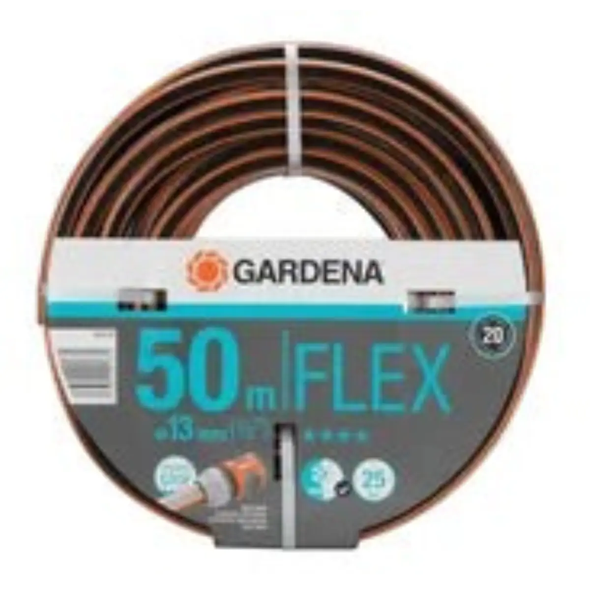 The GARDENA Comfort FLEX Hose 13 mm (1/2") is 50 m long with a diameter of 13 mm (1/2"). Use it in the garden to irrigate your plants reliably or to carry out cleaning work. The hose is dimensionally stable and flexible, and its high-quality hose structure makes twisting or knotting almost impossible. The Power Grip profile ensures a stable connection and optimum hold between the hose and the hose connector or water stop. As the hose is UV and frost resistant, it can remain outdoors all year round. Thanks to its high wall thickness, the water hose has a long service life and is suitable for burst pressures of up to 25 bar. It is pollutant-free and therefore free of phthalates (<0.1%) as well as cadmium, lead and barium (<0.1%). Add to the elastic garden hose as required with other system parts or connection devices from the Original GARDENA System. GARDENA offers a 20-year manufacturer's warranty on the Comfort FLEX Hose, which is manufactured in Europe.