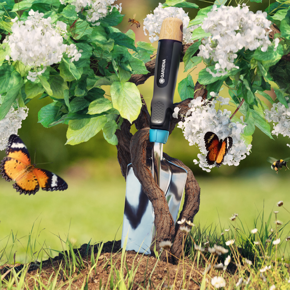 The GARDENA EcoLine Hand Trowel is sustainably designed for all your garden potting and planting tasks in flower pots, planters and beds. The plastic used for the gardening trowel is made from more than 85 percent recycled material, produced primarily from household waste. Steel made from more than 25 percent recycled metal. In addition to the environmentally-friendly aspects, the trowel impresses with its stylish design. The timeless and appealing design in combination with wood and metal elements makes gardening an elegant task. The GARDENA trowel's handle is ergonomically shaped for extra working comfort. Nothing stands in the way of effortless planting and repotting with this garden trowel. The FSC® 100%-certified wood comes exclusively from well-managed forestry. The quality product is Made in Europe and the product quality is supported by a 25-year GARDENA manufacturer's warranty. A natural choice for passionate gardeners. ReTh!nk - The new EcoLine range from GARDENA. Sustainably made. Aesthetically designed. Durably built.
