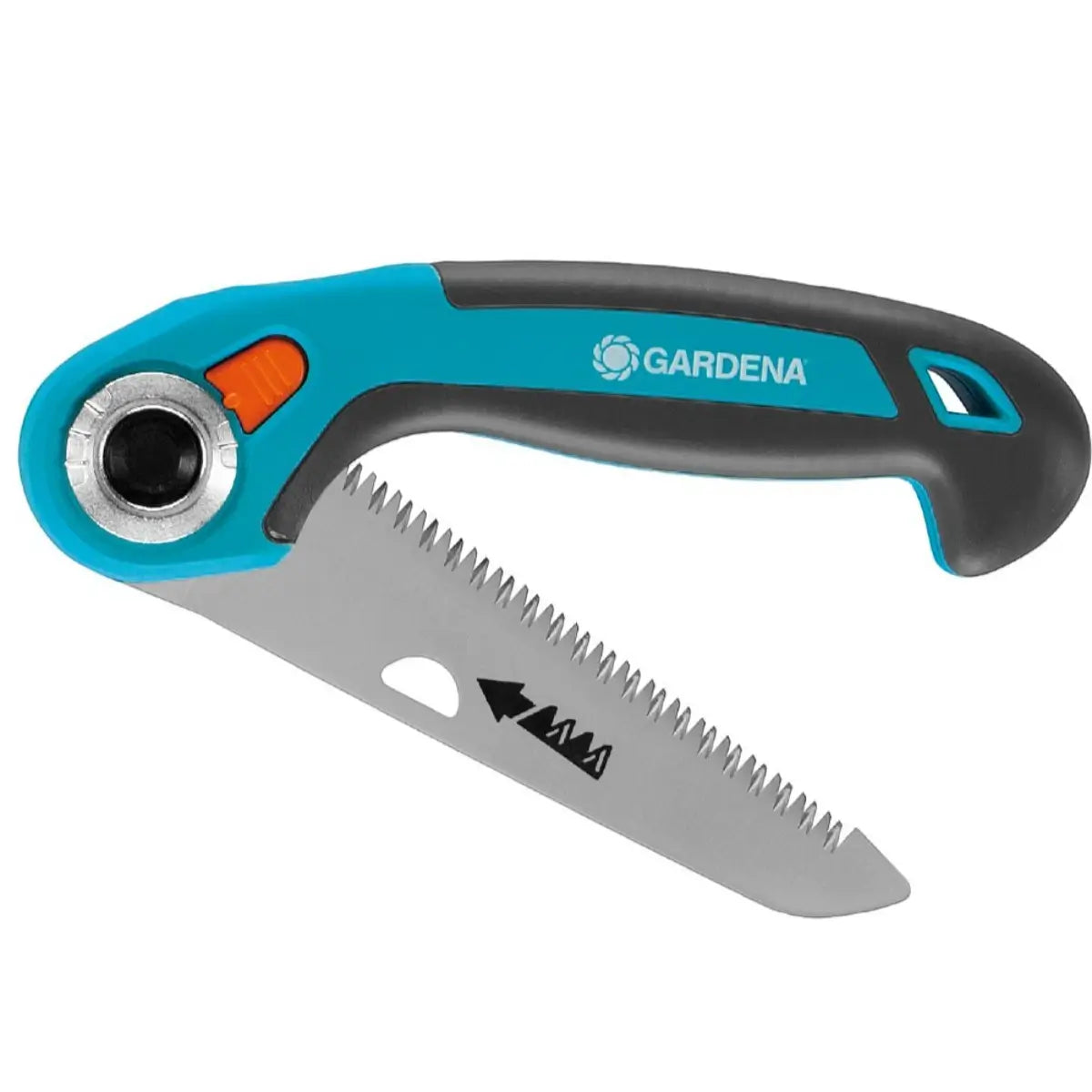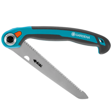 The handy Gardeners' Folding Saw 135 P from GARDENA supports you during sawing work. It has a usable saw length of 135 mm and uses tension for clean and precise cuts. The saw blade is hard-chrome-plated, has a long service life and is protected against corrosion. The impulse-hardened toothing with triple grinding delivers high precision and a smooth cutting result with little effort. This increases the sawing performance so that you can work with the hand saw for longer without tiring. The ergonomic handle with soft grip, including a slip stop at the end of the handle, prevents your hand from slipping during the pulling movements. The lockable saw blade allows you to change the cutting angle to 3 positions for precise cutting. After gardening, fold up the saw blade and it disappears into the stylish handle. For storage hang up the garden saw using the eyelet hanger to save space and keep it handy. The Gardeners' Folding Saw 135 P is a quality product that comes with a 25-year warranty from GARDENA. Express your vision with precision. Easy to use, effective and durable cutting tools for creative gardeners.