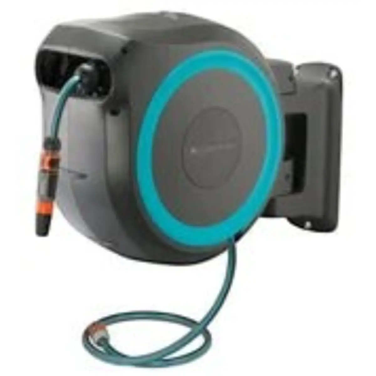 Watering that’s always ready for action: With the help of the Wall-Mounted Hose Box RollUp M/L, watering your garden becomes a comfortable pleasure. This Wall-Mounted Hose Box saves you from tiresome winding, dirty hands and a tangled hose. Mounted on any wall, your garden hose is stored safely and is extremely space-saving. For use, simply pull out the 25-metre hose to the desired length. As soon as you stop, the extra short locking points grip and secures the garden hose. Thanks to the practical wall bracket, the hose reel can be swivelled through 180° and follows your movements in the garden unnoticed. In this way you can easily do your watering work, have maximum freedom of movement and the hose does not kink. No bending or winding is necessary to roll up the hose: a light pull on the end of the hose is enough to release the lock. The high-quality steel spring inside the box then rolls the hose up automatically, reliably and evenly for you. The innovative RollControl technology ensures safe and controlled retraction. Thanks to the integrated hose guide, there are no knots or kinks when rolling up the hose, preventing damage to the garden hose. With the tap and hose connections from the Original GARDENA System you can flexibly extend the hose or attach other GARDENA Watering Attachments. Your GARDENA Hose Attachments are always ready to hand: they can be attached underneath the wall bracket and be stored there to save space. The high-quality material is protected from various types of weather by both UV and frost protection and can therefore be used all year round. The box is equipped with theft protection. The hose box comes with all necessary connecting parts: wall bracket, a connecting hose, all necessary Original GARDENA System and Assembly Parts as well as a nozzle with two different spray jet options. GARDENA gives a five-year warranty on the high-quality hose storage.