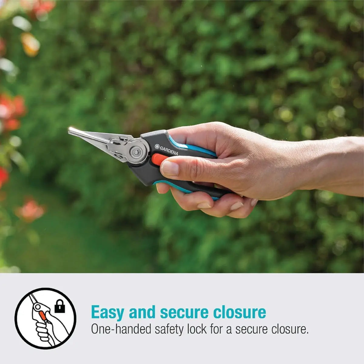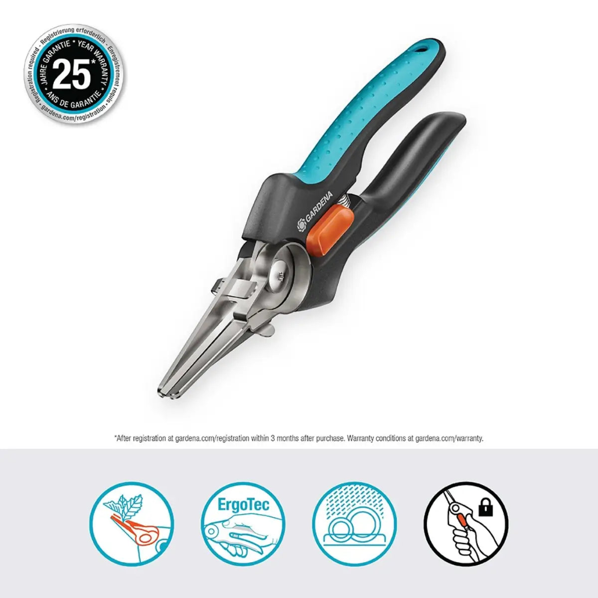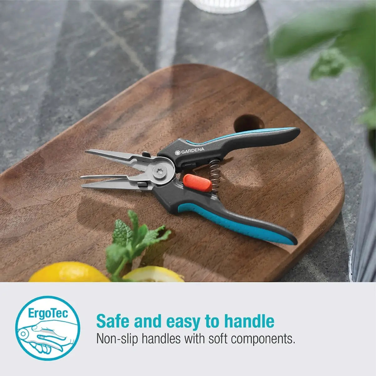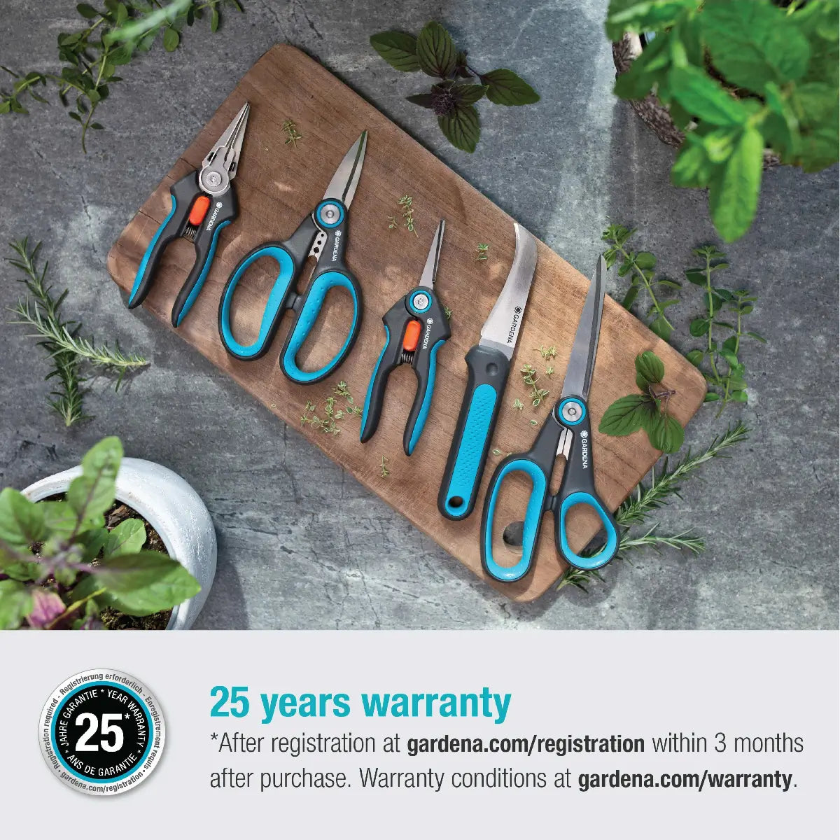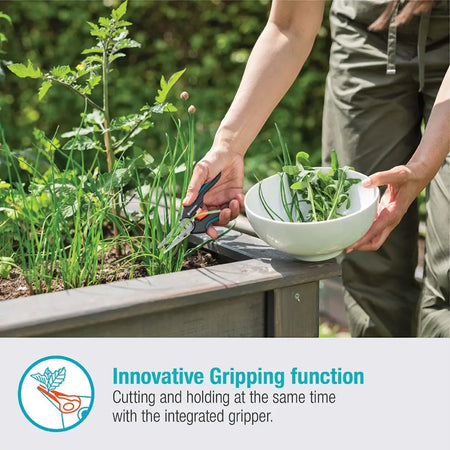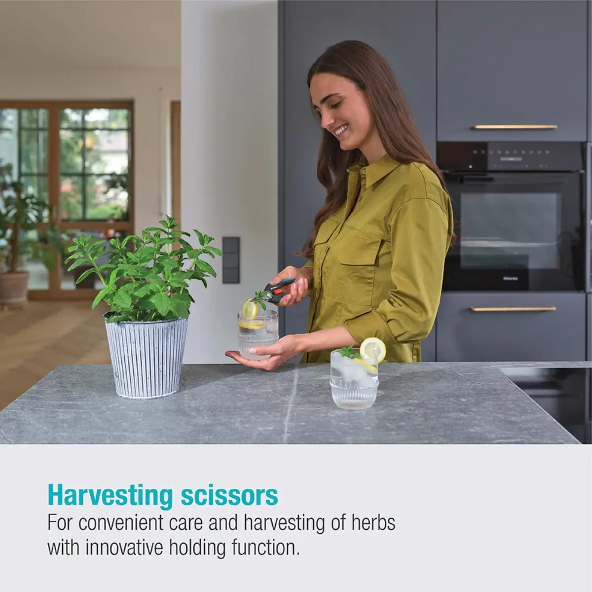 The GripCut by GARDENA is equipped with a Gripper and allows you to cut and hold at the same time with just one hand thanks to the built-in holding function. The versatility of the GripCut is extremely useful: Cut fresh herbs such as a sprig of parsley or chives and hold them at the same time. Harvesting chillies in particular is made easier and no spicy juice will get on your fingers. You won't drop any of your harvest, plus you have a free hand to hold a bowl or strainer, meaning you no longer have to keep bending down to put things in a container on the floor. When cutting, the high-quality and durable stainless steel blades are very convincing. With the sharp blades, you can make clean and precise cuts right to the tip. Thanks to the ergonomic ErgoTec handles with soft components, the harvesting scissors fit perfectly in your hand and are non-slip. The one hand locking mechanism helps you safely close the GripCut for storage. The blades are food-safe and do not give off any taste or smell. For easy cleaning, simply disassemble the Gripper first and then put it in the dishwasher together with the GripCut. GARDENA underlines the high quality of the GripCut with its long manufacturer's warranty of 25 years after registration at gardena.com/registration within 3 months after purchase. Handle with care. GARDENA Micro-Cutting. Give your harvest the respect it deserves with our range of precise tools.