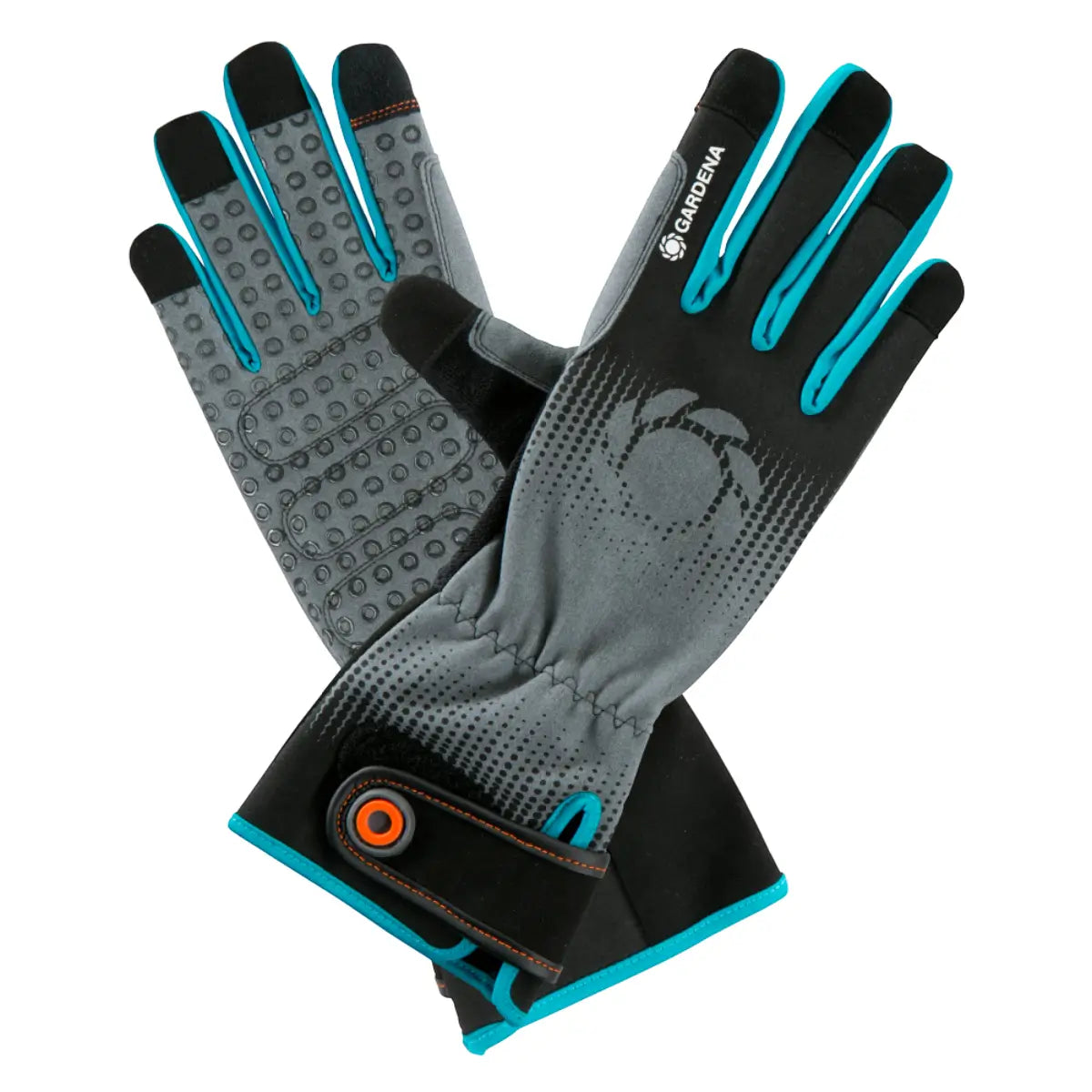 The Shrubcare Glove in size M from GARDENA is your perfect companion when cutting shrubs and dealing with dense undergrowth in the garden. This durable gardening glove for large hands is designed with a robust material that protects you from scratches or nettle stings. The long cuff protects your wrist and lower forearm. When using gardening secateurs you will feel high-quality workmanship of the gloves. In addition, the fabric between the thumb and index finger is reinforced, as this area is often subject to particularly heavy wear and tear, meaning the glove can be used for a long time. The Shrubcare Glove offers a lot of comfort: the palm of the glove is silicone-coated, which means that secateurs not only fit securely in your hand, but cannot slip out. Even the operation of a smartphone or tablet is possible at any time thanks to the Mobile Touch function on the thumb and index finger. As the smartphone-enabled Shrubcare Glove has Oeko-Tex® Standard 100, the textiles used are free of harmful substances.