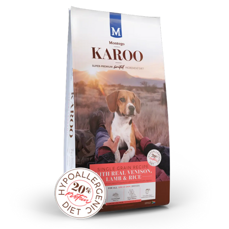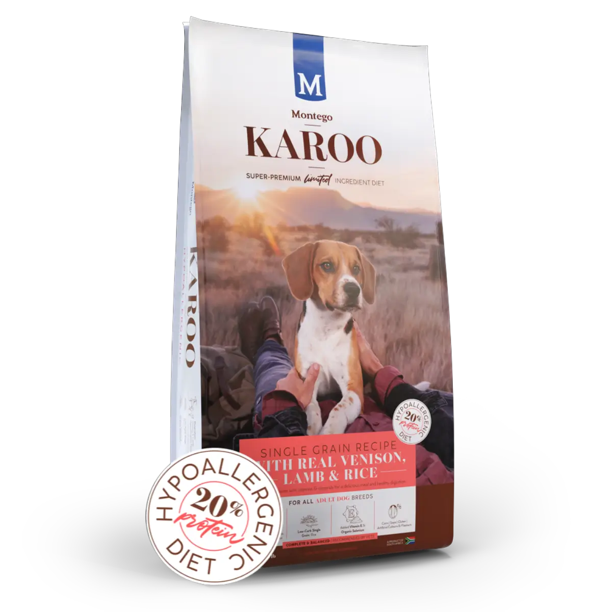 At the peak of physical development, adult dogs with food sensitivities require nutrition that enhances their physique and feeds their minds, while keeping them healthy, active, and free of the discomfort or irritation associated with dietary allergies. Scientifically formulated and nutrient-rich, Montego Karoo Adult’s super-premium, limited ingredient, hypoallergenic recipe provides adult dogs of all breeds and sizes with an optimally balanced diet.