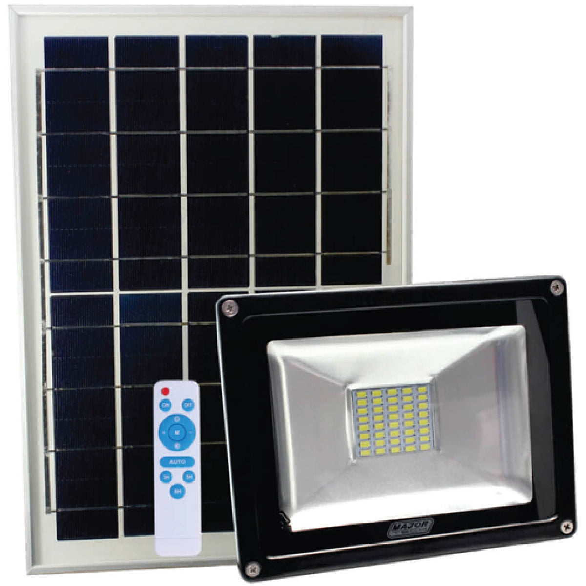 High-output solar LED flood light for outdoor areas, security and garden illumination.